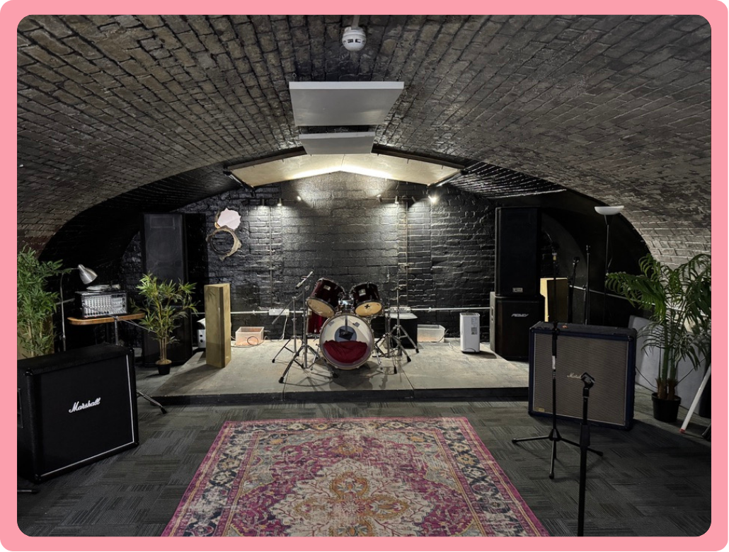Our main rehearsal space, this is a big arch - 8m x 6m with a drum riser and loads of space for big bands or musicians that like to run around (not drummers, obvs). Want to put on an event such as a secret gig or listening party? Call Planet Sounds at 023 8033 4040 to enquire! Prices vary.
